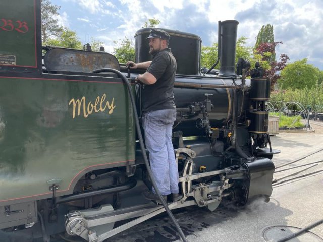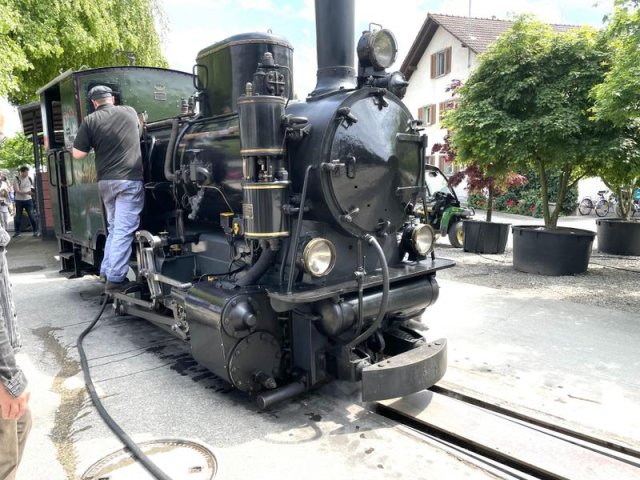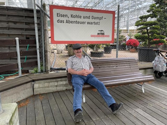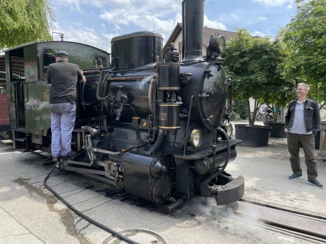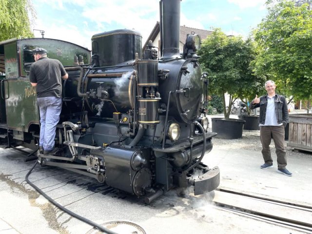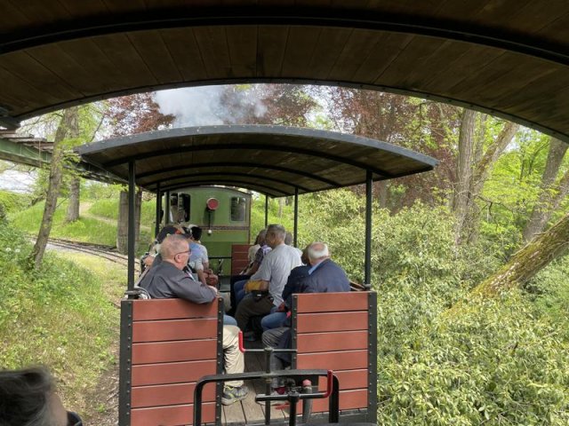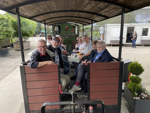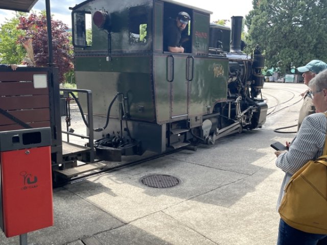 Nach dem Essen wartete schon die Baumschuldampfbahn auf uns. Die Handys waren im Nu gezückt als der Dampfzug einfuhr. Nachdem die Lok von allen Seiten photographiert war, ging es auf die Baumschulfahrt.